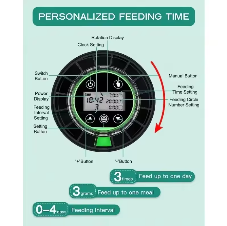 -Digital Timer Control: Schedule up to 4 meals a day with custom rotations for a consistent feeding schedule.